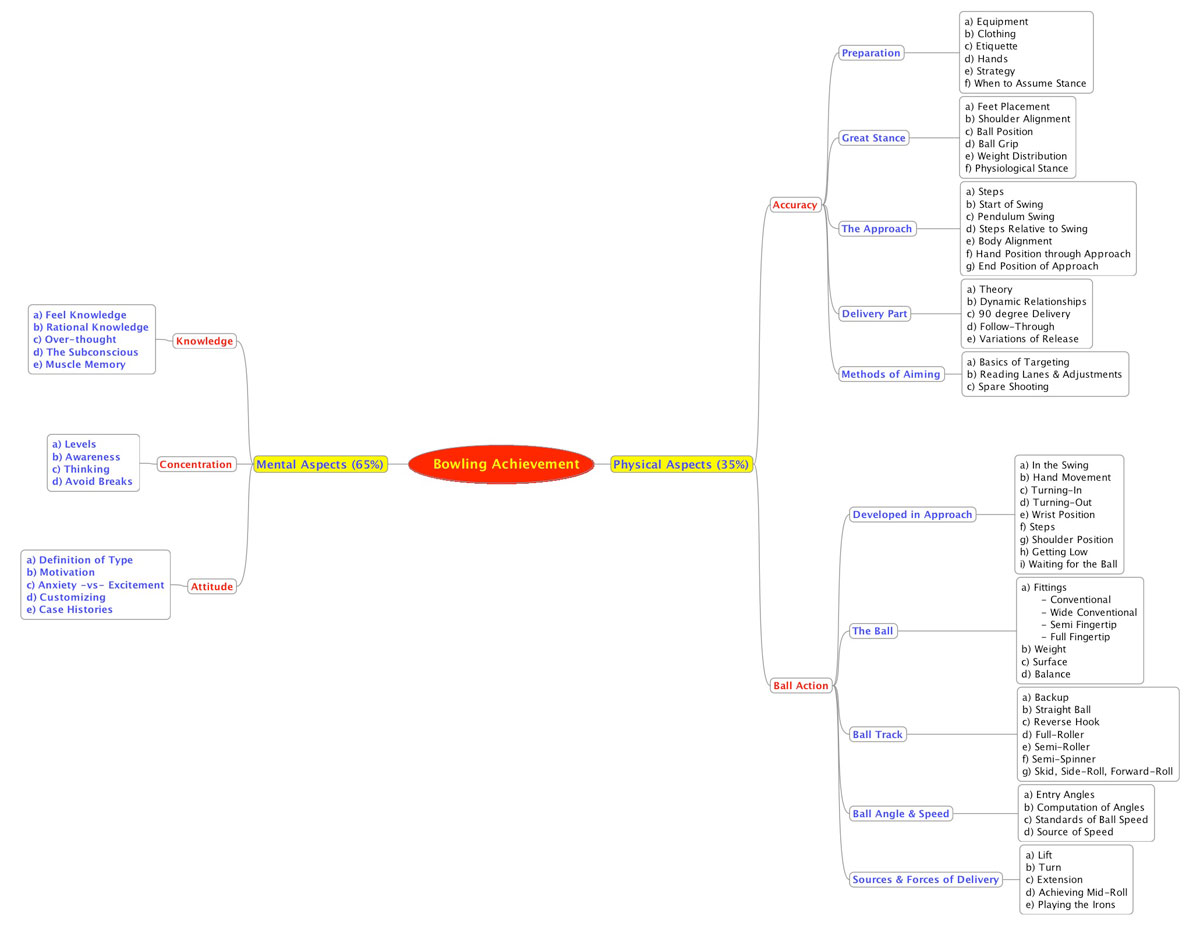 Basically, the teaching gives initial consideration to the Mental Aspect of Bowling and then moves through Preparation, Stance, Approach, etc.. At this time, take a moment to review the chart below. Study it carefully. Then ask yourself about what should comes first. “Action or Accuracy?” “Approach or Preparation?” “Ball Track or Angle?” Learn to recognize the proper sequence from beginning to end. You may click on the image itself for the enlarge version. You are advised to bookmark this page for future reference of this valuable mindmap.